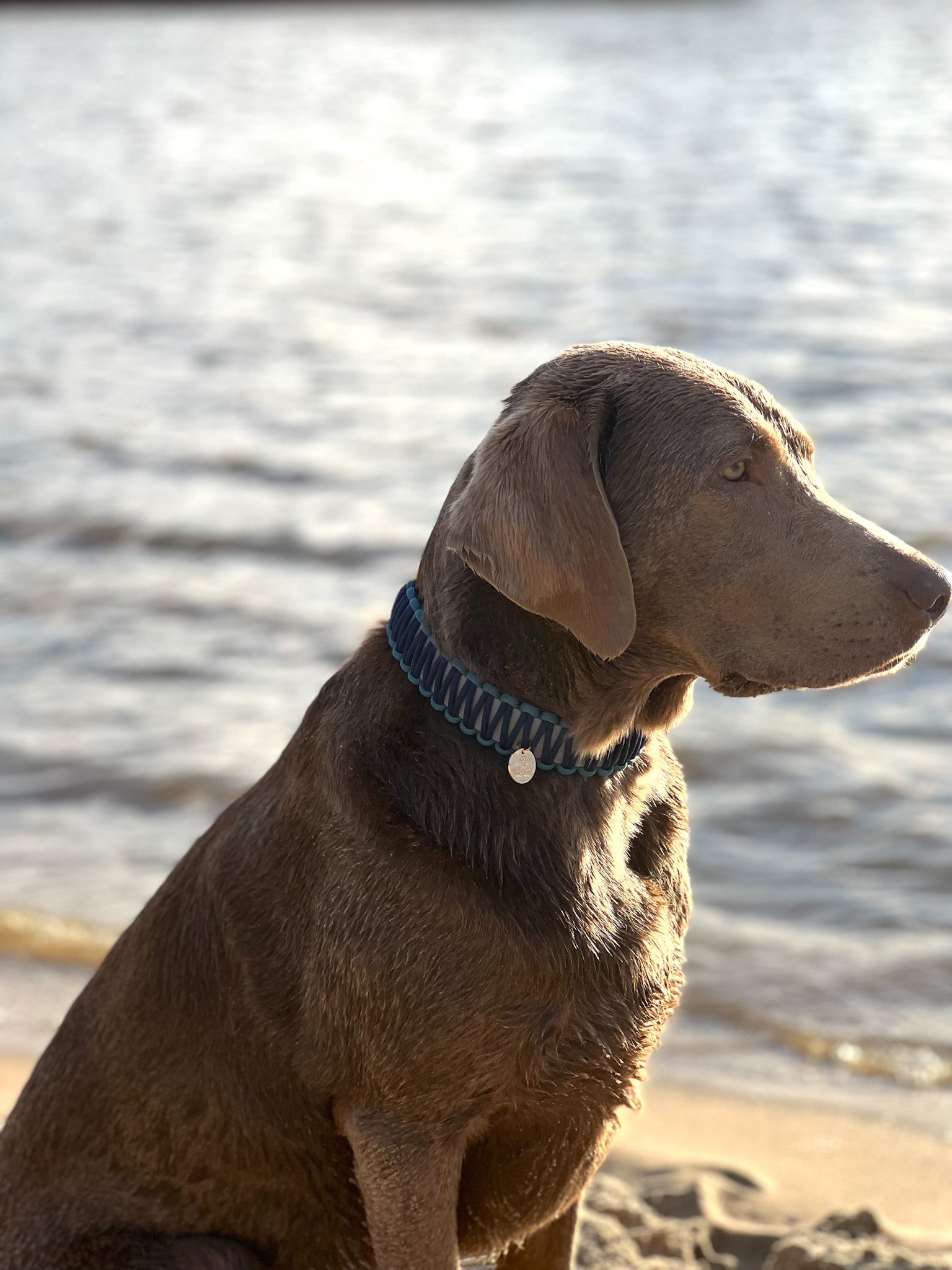 Unser Halsband "Emilia" ist eine Kombination aus graublauer BioThane® und einer Paracordumwicklung in den Farben dunkelblau und petrol.